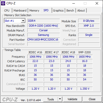 To identify your specific RAM kit, you can (fortunately) also get that information from CPU-Z’s “SPD” tab, which I’ve screenshotted with my own RAM below. Online, I purchased 16GB of Corsair Vengeance Pro RGB RAM, but CPU-Z reveals yet more pertinent information on the hardware used within.
